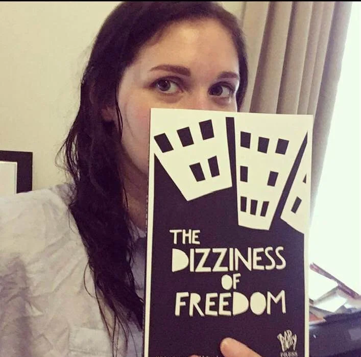 Photo of Amy Acre holding up a copy of the book “The dizziness of freedom” in front of most of their face. Amy has long dark hair, pale skin and is wearing a light grey T shirt.