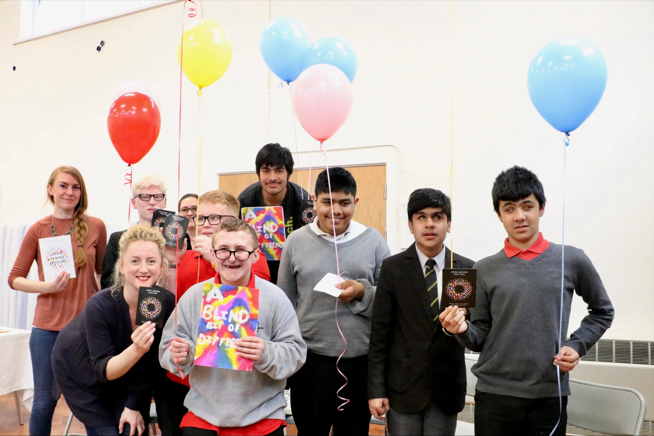 Photograph with Resident Poet and Sensory Poetry Educator Amy Neilson Smith and English teacher Megan Gosling, alongside a group of eight student-poets (AKA metaphorical wizards!) with pink, yellow, red and blue helium balloons floating in the air on strings. The student-poets hold Open Senses Festival flyers and several posters for the A Blind Bit of Difference book.